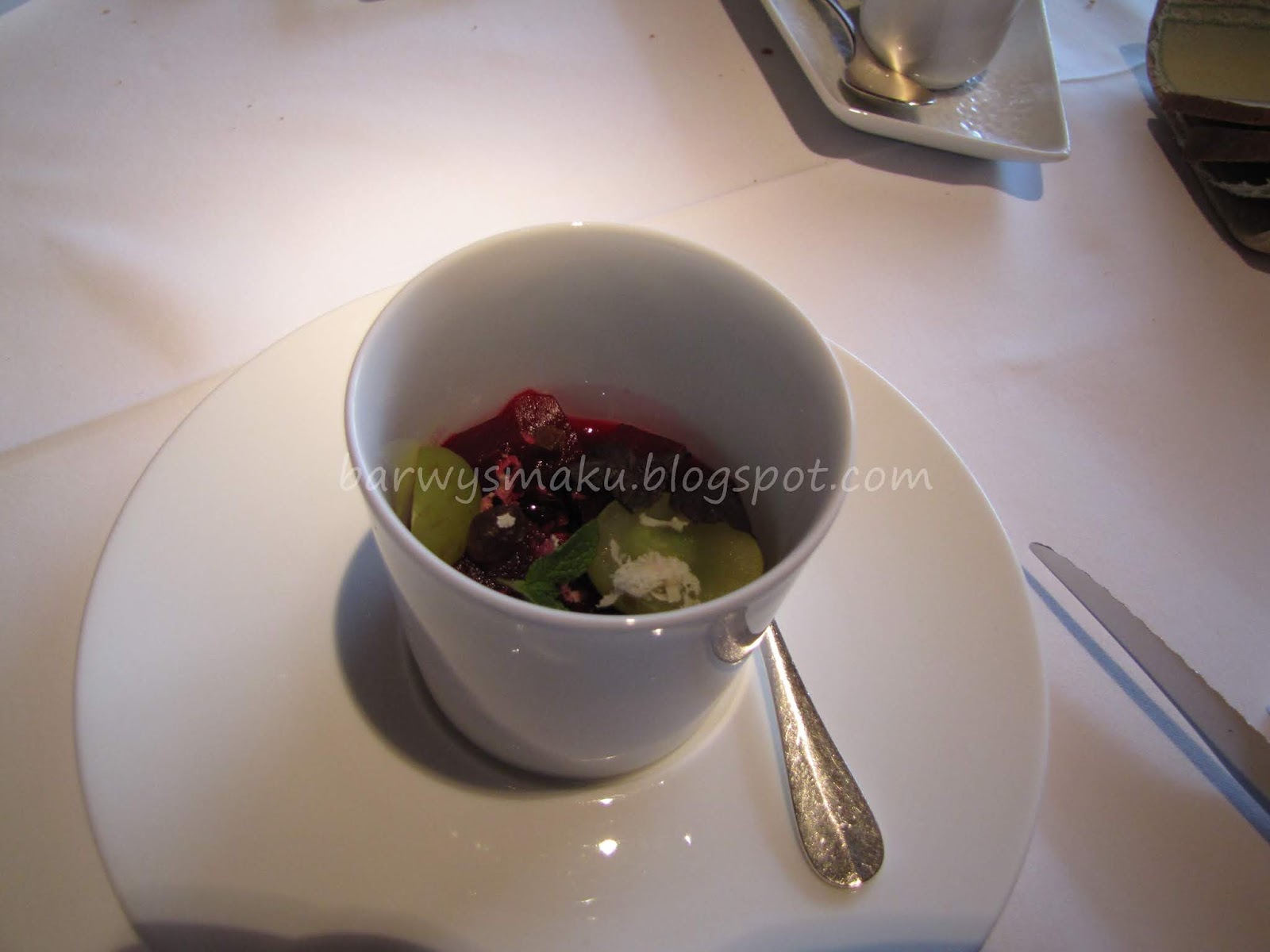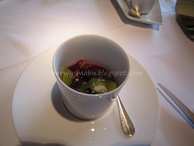 sosu na porcję, nakładać na podgrzane płaskie talerze. Na tym ułożyć po kawałku